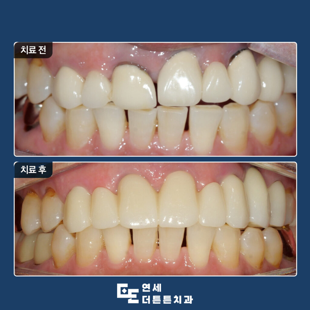이미 치아가 상실된 부위에는 임플란트 식립을 먼저 시행하였으며 전반적인 조화를 고려해 지르코니아 브릿지로 최종 보철을 완성하였습니다.
