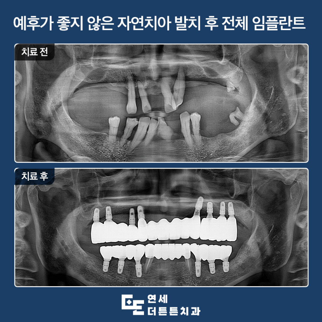 망월사역치과 예후가 좋지 않은 자연치아 발치 후 전체 임플란트 수복망월사역치과